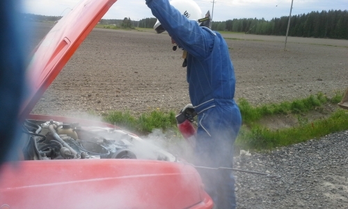 Kolmosen lähtö oli vain muutaman kilometrin päästä Jukan kotoa ja semi-tutuilla ja edelleen äärimmäisen nopeilla teillä kyyti oli kohdallaan. EK:n loppupuolella Hohontiellä kone sammui ja äänistä kuulimme heti, jotta ihan pikkuviasta ei ollut kyse. Kun vauhti hiljeni ennen sivutielle kurvaamista alkoi savua tupruta hyttiin ja sitten meillä olikin hetken aikaan todella kiire! Koko kosla meinasi palaa! Lohkon molemmille puolille oli tullut reiät, joten tuho koneessa oli totaalinen. Paikalle rientänyt sulkumies kertoi liekkien tulleen pitkälle auton perästä.
